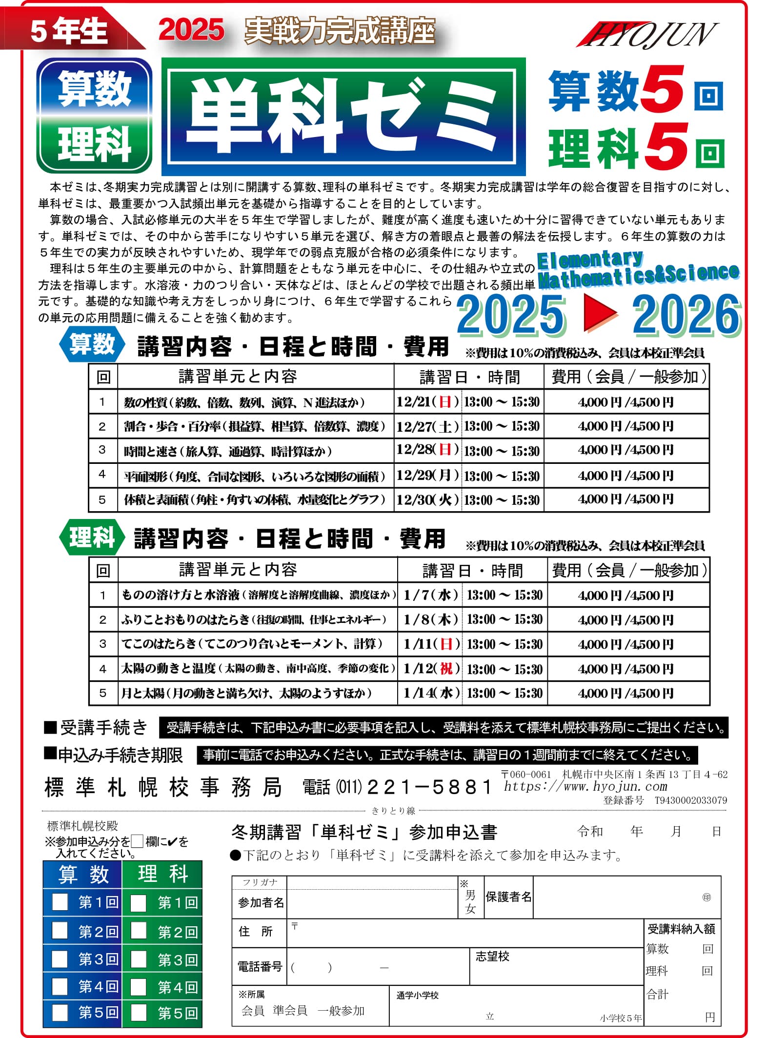 本ゼミは、冬期実力完成講習とは別に開講する算数、理科の単科ゼミです。